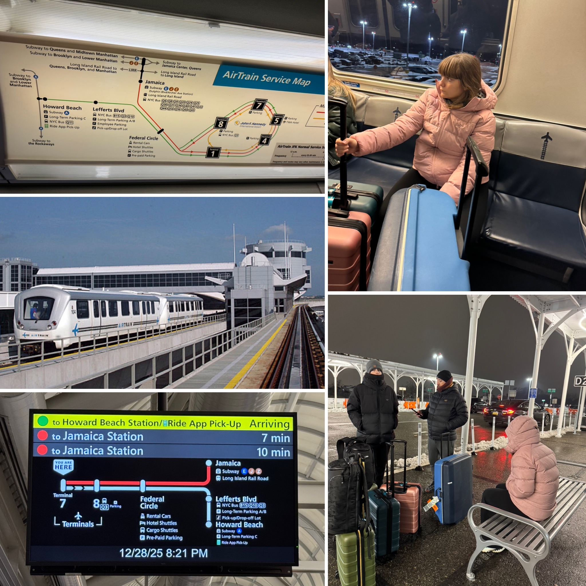 Al sortir anem direcció a recollir la maleta. I ja sortim a l’exterior, Per anar a buscar un Uber, s’ha d’agafar el Airtrain, un trenet petit i en alçada que circula en bucle, l’ agafem a la terminal 7, i baixem a la quarta parada, Howard Beach, on hi ha Ride App Pick-up, i ens abriguen i caminem fins a la D2, on recull Uber.